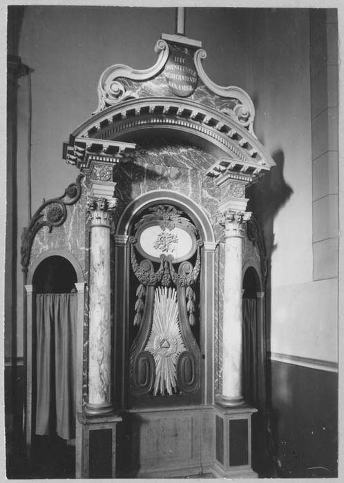Ce meuble est singulier par sa hauteur. Deux colonnes, surmontées de chapiteaux composites, soutiennent un fronton arrondi et accostent une porte ajourée, sculptée et dorée, où l'on remarque les clefs, allusion au pouvoir du prêtre de lier et délier, et le triangle isocèle irradiant, symbole de la Trinité.