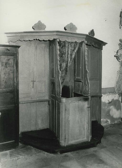 Meuble formé de panneaux enserrés dans un lambris monté sur socle à trois côtés constituant l'emmarchement. Sur ce socle, deux parcloses avec courbes et contrecourbes à volutes délimitant l'espace du confesseur fermé par une petite porte basse. Dais festonné à trois pans avec trois petits médaillons fleuronnés sur la corniche.