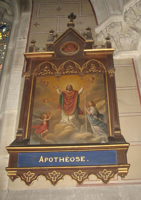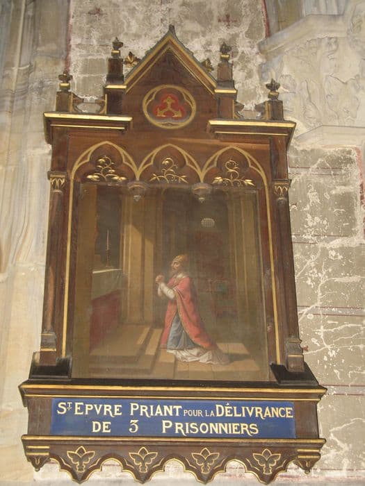 POP | Plateforme ouverte du patrimoinesix tableaux de la vie de saint Epvre et leurs cadres : Saint Epvre enfant donnant son manteau à un pauvre, Saint Epvre priant pour la délivrance de trois prisonniers, Les prisonniers délivrés de leurs chaînes par saint Epvre, Saint Epvre exorcisant un possédé, Mort de saint Epvre, L'Apothéose de saint Epvre