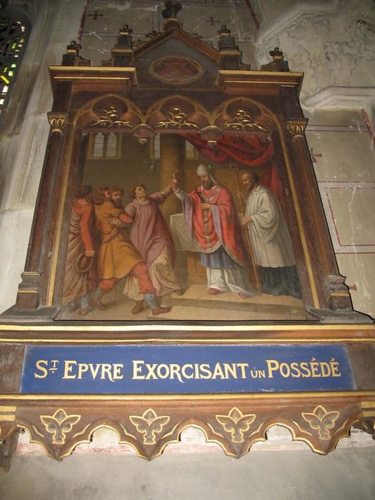 six tableaux de la vie de saint Epvre et leurs cadres : Saint Epvre enfant donnant son manteau à un pauvre, Saint Epvre priant pour la délivrance de trois prisonniers, Les prisonniers délivrés de leurs chaînes par saint Epvre, Saint Epvre exorcisant un possédé, Mort de saint Epvre, L'Apothéose de saint Epvre