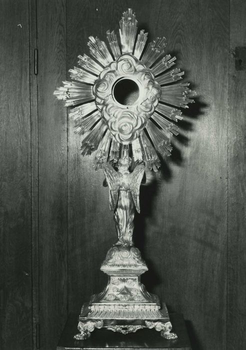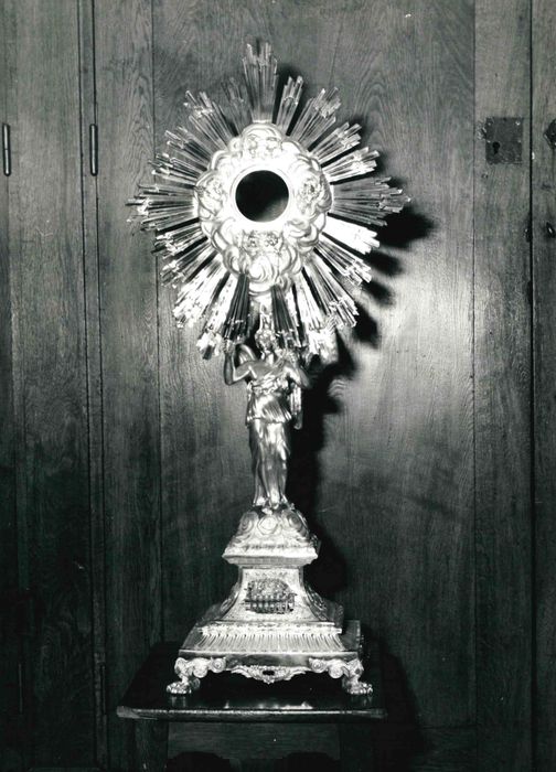 Ostensoir en argent doré et vermeil. Pied doré de forme rectangulaire avec quatre pattes d'animaux à griffes. Double moulure en scotie, l'une cannelée, la plus importante avec médaillon (agneau pascal sur le devant, triangle trinitaire à l'arrière). Noeud rectangulaire à la base, hémisphérique à la moitié supérieure et supportant un ange ailé, en argent, vêtu d'une tunique plissée. Partie supérieure en forme de soleil supporté par la tête de l'ange. Custode centrale nimbée d'un nuage d'argent avec têtes d'angelots à l'avant d'où partent des rayons dorés.