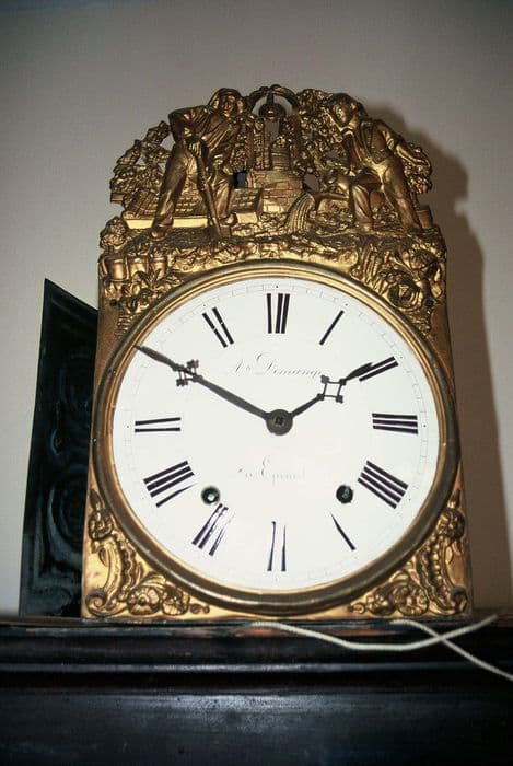 Horloge en laiton doré avec cadran en cuivre émaillé et coffre en bois mouluré. Motif au jardinier.