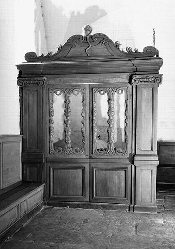 La clôture des fonds baptismaux est composée de lourdes portes à claire-voie, flanquées, chacune, de 2 pilastres ioniques. L'ensemble est surmonté de 2 frontons à volutes ornés, au sud d'une boule entourée d'un serpent et, à l'est de deux sarments de vigne entrelassés (?).