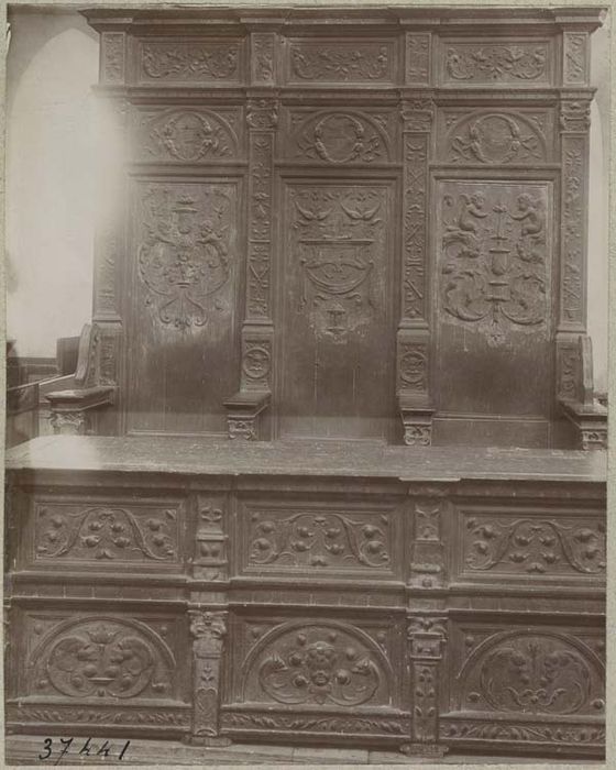 Banc à haut dossier formé de panneaux sculptés et décorés d'arabesques, encadrés de pilastres ornés sur les chapiteaux desquels repose la corniche. La face antérieure du banc est pleine et les panneaux sont également ornés. Enfin, en avant du banc, la crédence est décorée de panneaux richement sculptés.