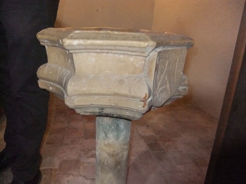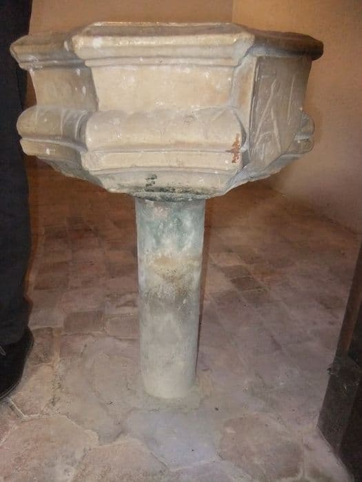 La cuve, octogonale est sculptée de feuilles sur un bandeau qui en fait le tour.