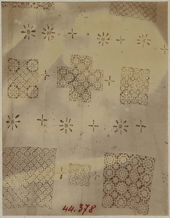 Composée de motif de dentelle guipure (Venise) réunis par de grands entre deux de toile brodée au point coupé. Le motif central est une croix à branches d'égale grandeur (style du 16e siècle). Ornée en bordure, sur les 4 côtés, d'une dentelle découpée en dents arrondies, et comprenant deux morceaux réunis par une couture.
