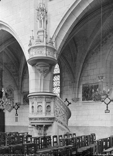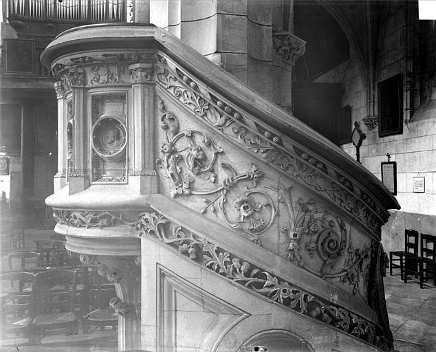 Cuve cylindrique décorée de pilastres supportant une frise ornée de monogrammes, et encadrant des panneaux à médaillons sculptés. Le rampant de l'escalier tournant est plein et décoré de rinceaux. L'abat voix est moderne.