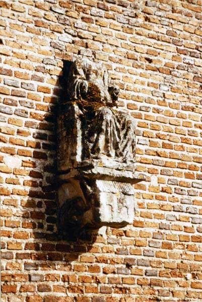 Statue extérieure acéphale (Enfant et tête de la Vierge disparus depuis au mons 1848) de la Vierge assise dans un fauteuil. La statue repose sur un socle formé d'une église soutenue par deux anges plaqués latéralement et horizontalement : c'est la maison de Lorette (rareté du thème iconographique).