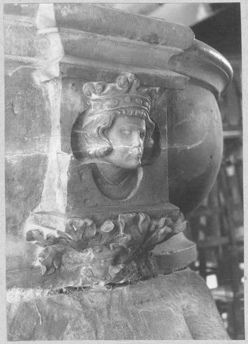 Forme ovale. Cuve circulaire, resserée à la base, et dont le bord supérieur est orné d'une forte mouluration. Sur le devant et sur une ... au soubassement feuillagé se détache en haut relief une tête portant la couronne de marquis.