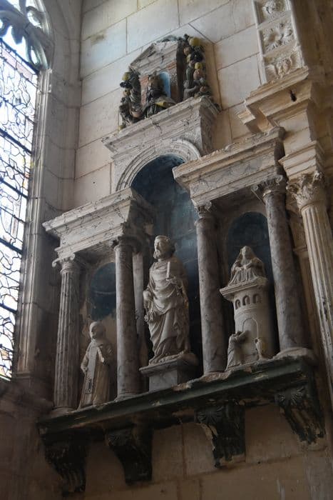 POP | Plateforme ouverte du patrimoineretable, 3 statues : Saint Pierre, Sainte assise au sommet d'une tour, Saint religieux