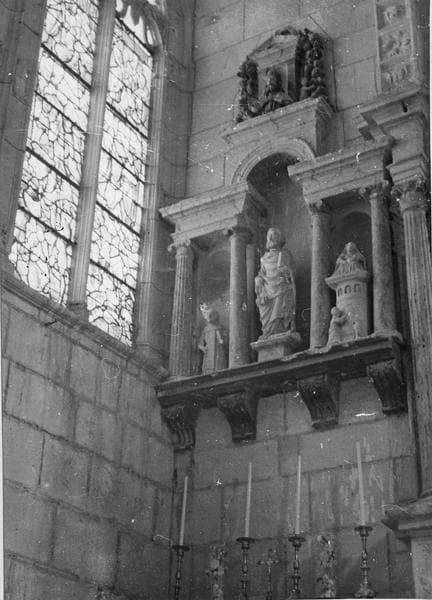 retable, 3 statues : Saint Pierre, Sainte assise au sommet d'une tour, Saint religieux
