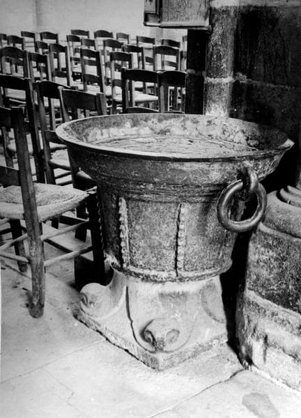 Deux bénitiers et les chapiteaux qui leur servent de socles. Bénitiers en forme de tronc de cône renversé, ornés à la base d'une légère saillie où viennent s'arreter 8 petits contreforts denticulés. La partie supérieure se compose de 3 fortes moulures surmontées d'une boule qui accentuent la forme évasée des bénitiers. 2 anses arrondies et bien saillantes, prenant sur les 3 moulures et sur cette bande, maintiennent les anneaux.