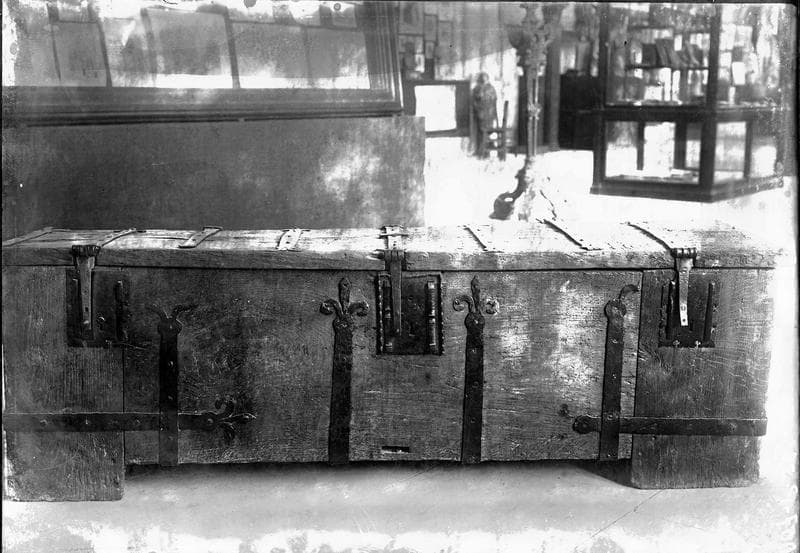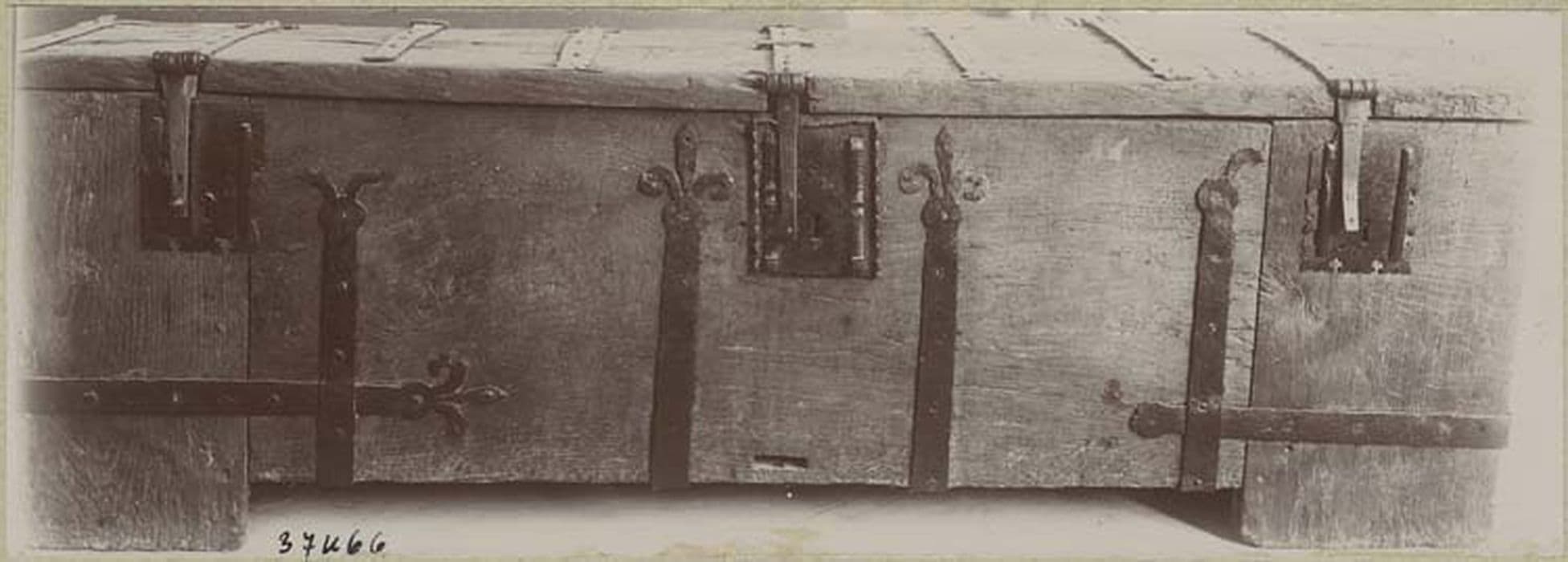 Bahut formé d'ars de chêne assemblés et unis, avec pentures de fer forgé consistant en longues plates bandes terminées en fleur de lys. Sur le devant, trois serrures à moraillon dont l'entrée est ornée de plaques découpées et ornées de petits pilastres en relief.