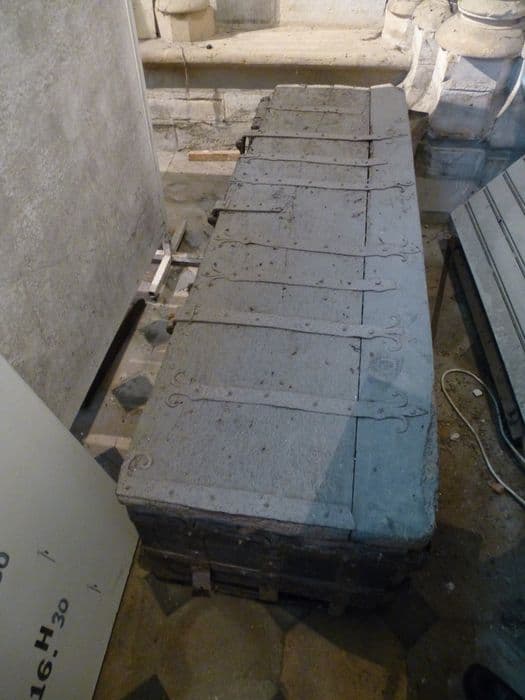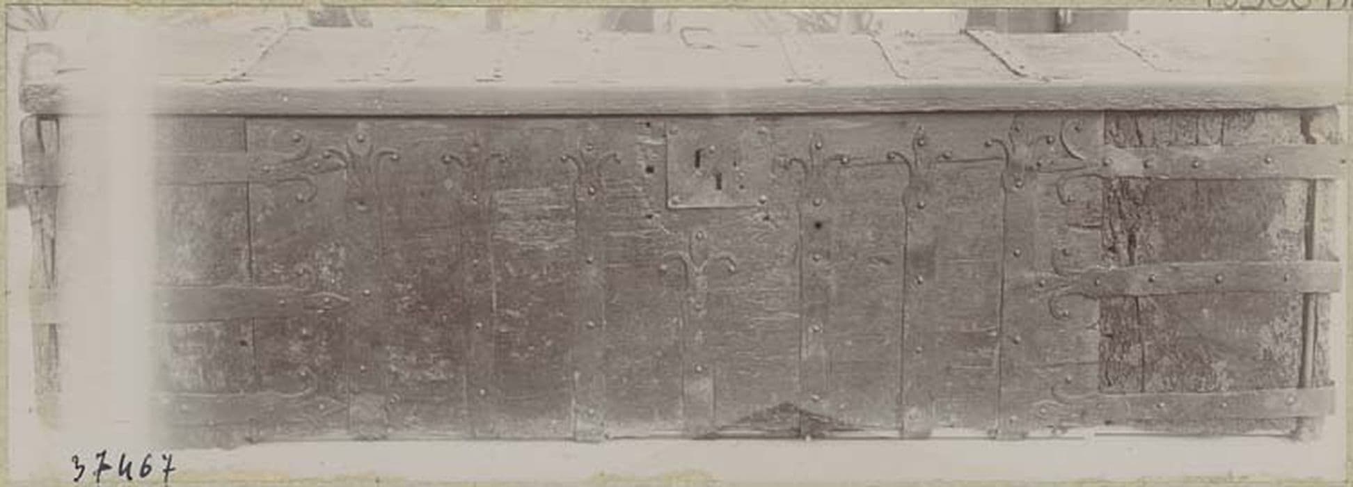 Bahut formé d'ars unis à assemblages, garnis sur toutes les faces de plates bandes de fer forgé terminées en fleurs de lys. Pas de serrure.
