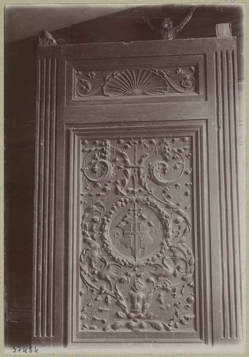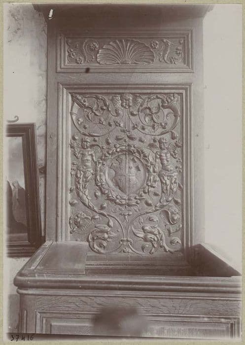 Panneau formant dossier de la chaire. Grand panneau rectangulaire offrant au centre dans une couronne de fleurs et de fruits les armoiries de la métropole de Sens, le tout encadré d'arabesques. Frise meublée d'une coquille soutenue de deux consoles.