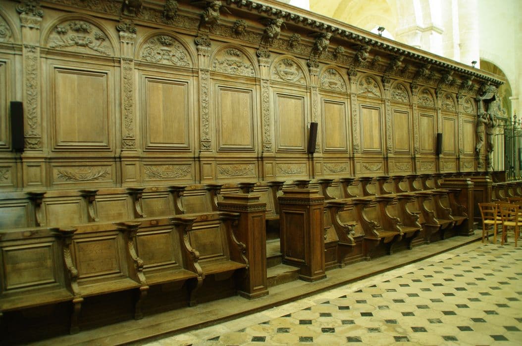 Porte à double vantail, surmontée d'un cintre à l'intérieur duquel sont figurés en bas-relief deux anges soufflant dans la trompe. De chaque côté de la porte s'étend un rang de stalles. A l'entrée de chacun d'eux, se dressent deux statues d'anges, de taille humaine, soutenant un baldaquin.