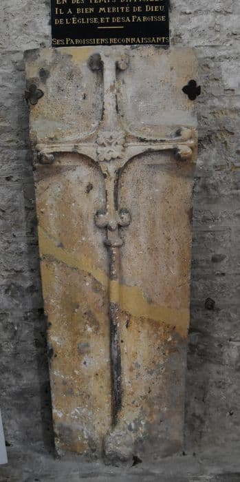 Couvercle de tombe décoré d'une croix en relief. En forme de dos d'âne à quatre versants. Sur la crête, sculptée en relief, est une croix emmanchée d'ne longue hampe, terminée en fleurs de lys, ornée à l'intersection des bras d'une rosace à quatre fleurons.