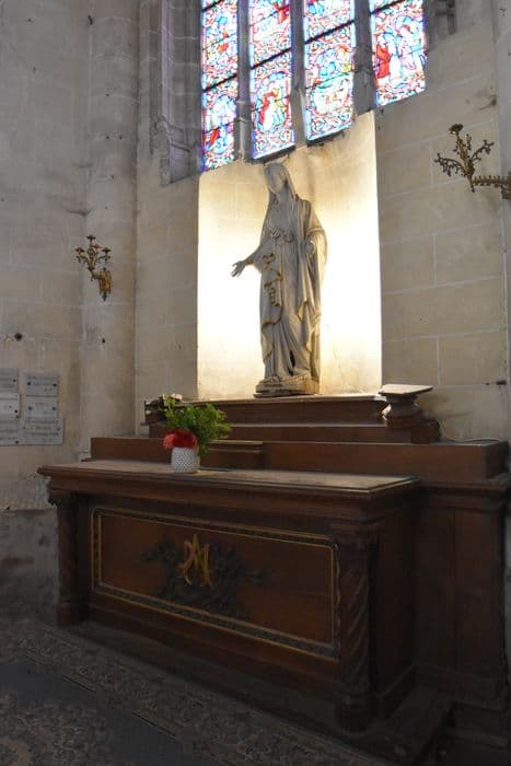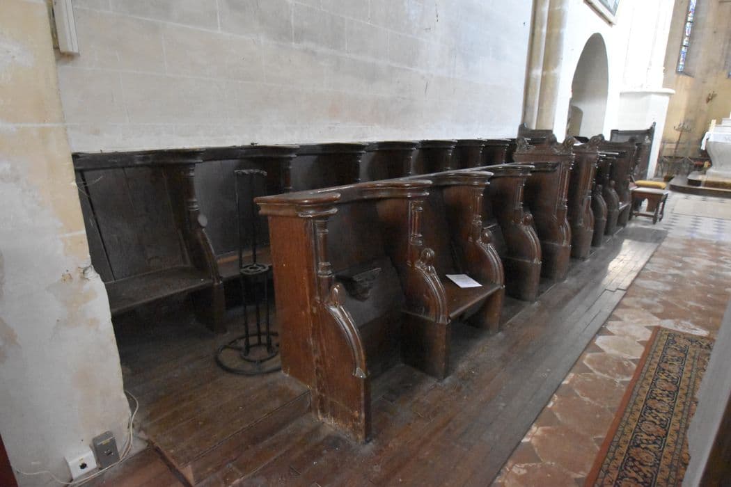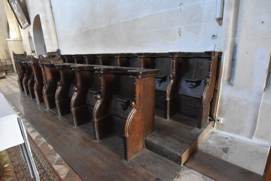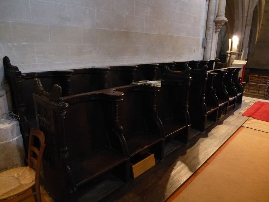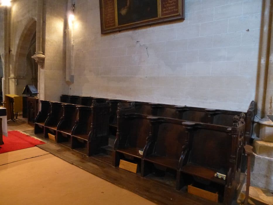 Les jouées sont ornées de panneaux à fenestrages flamboyants à leurs extrémités une colonnette dégagée s'arc-boute à la base. Au-dessus de chaque jouée : 2 pommes formées d'algues ou de feuillages retombent.