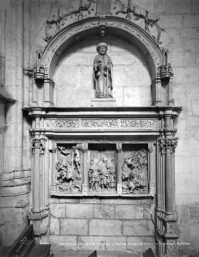 Retable en forme de portique Renaissance couronné d'un arc en plein cintre exhaussé (?) par 2 niches. Sous la frise ornée de rinceaux, 3 scènes de la vie de saint Julien l'hospitalier séparées par 4 colonnettes, sont sculptées en bas-relief et fort mutilées.