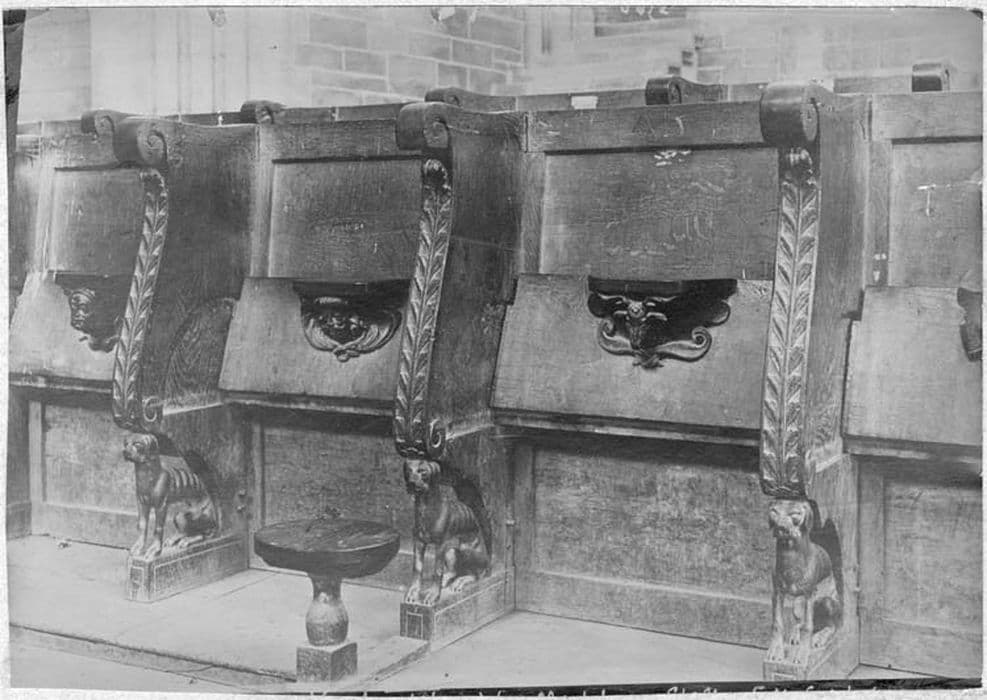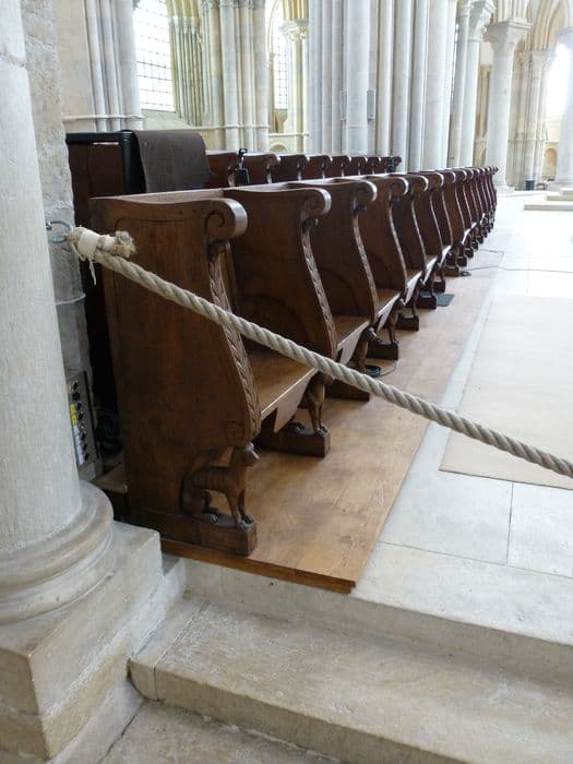 Stalles séparées par des accoudoirs ornés de feuilles de chêne posées symétriquement et supportés par des lions assis ; aux miséricordes, mascarons ailés.