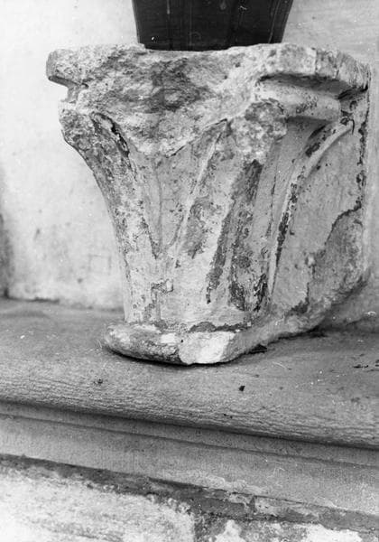 2 chapiteaux à crochet : l'un (à droite) est le chapiteau d'une colonne centrale ; l'autre (à gauche) est celui des retombées latérales ou chapiteau d'angle.