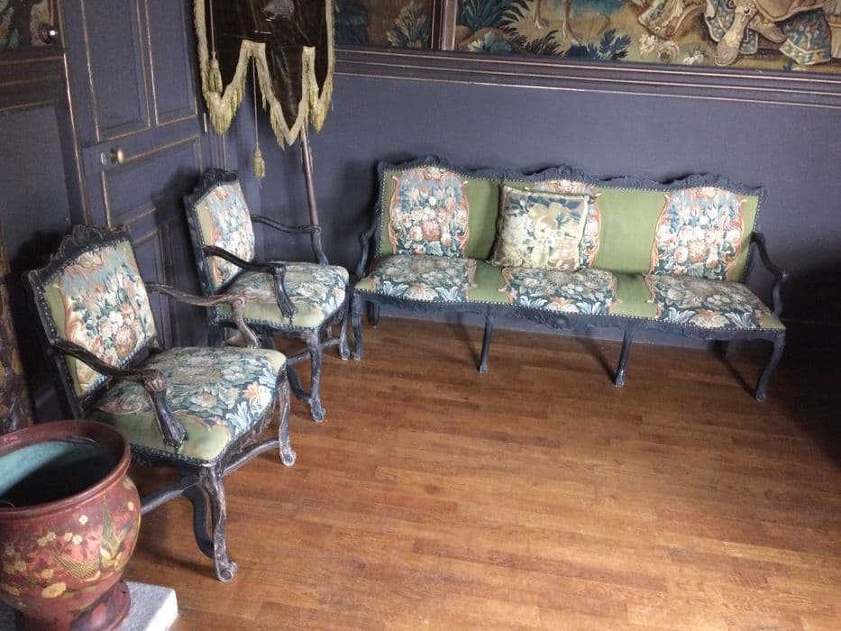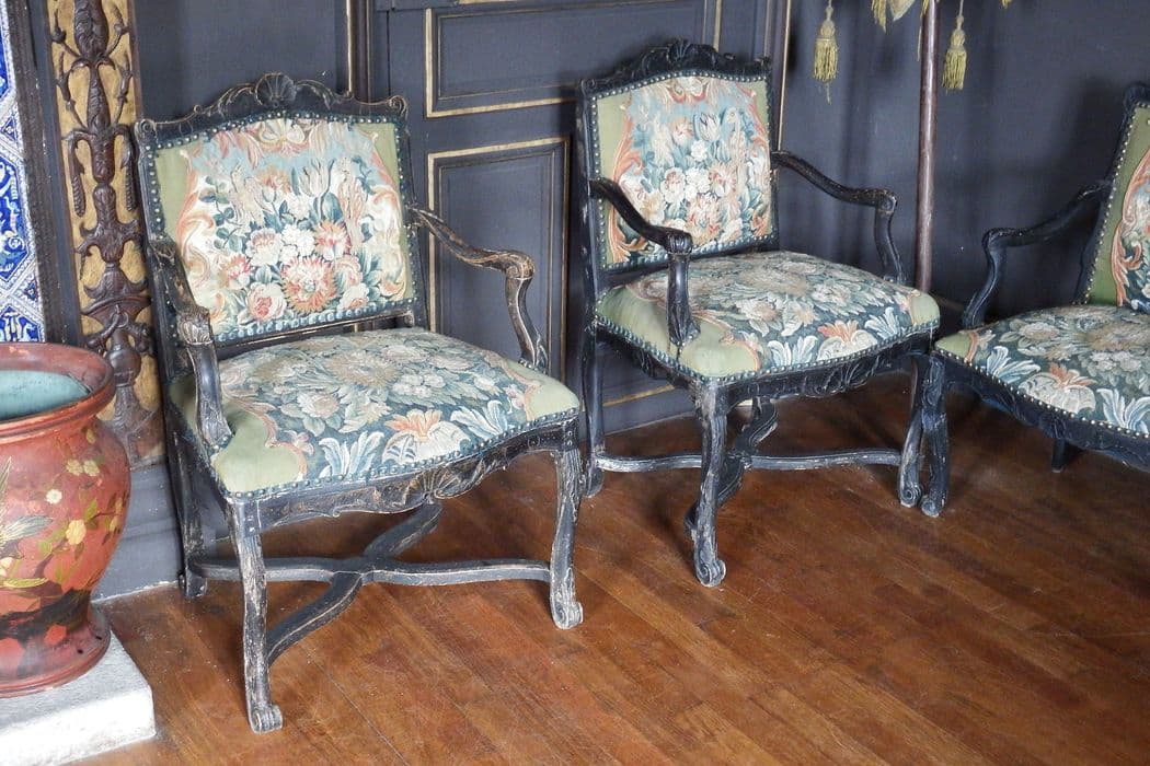 Sièges en bois peint en noir recouverts de tapisseries ornées de pavots.