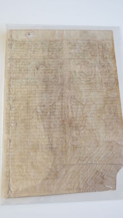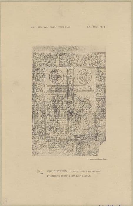 Inv. 1. Manuscrit (fragment) : feuillet de parchemin contenant un dessin au trait central, figurant la Crucifixion, et entouré de 16 petits tableaux carrés représentant des scènes de la Passion et de la Résurrection