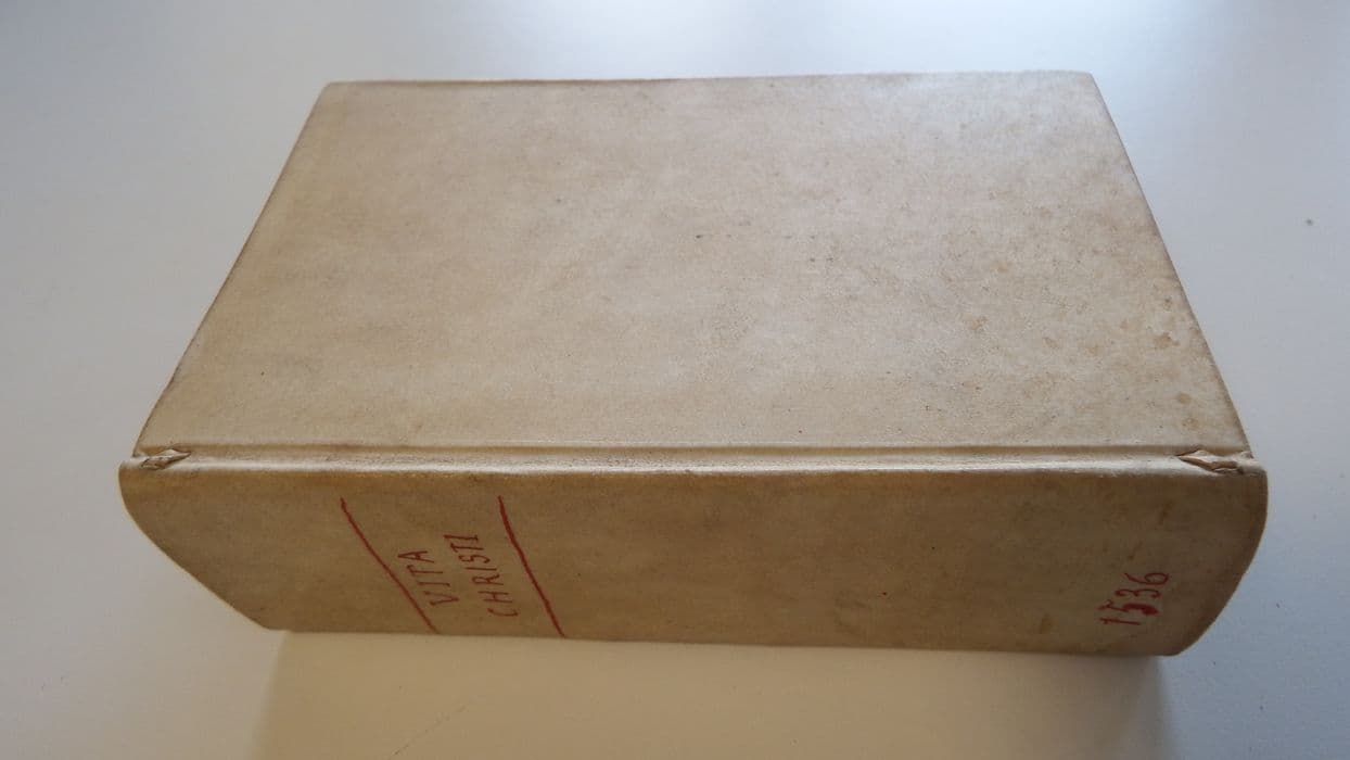 Inv. 38. Imprimé : Vita Christi. Paris, Vve Kerwer, 1536. In-8° goth. à deux col. avec lettres initiales ornées. 2 folios blancs, 16 folios non paginés et 573 folios paginés, plus un folio terminal refait. Reliure velin fatiguée.