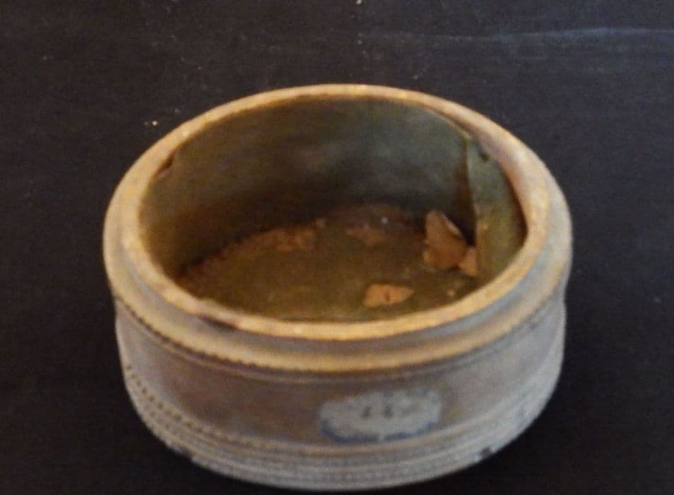 Inv. 44. Ivoire : fragment de boîte ovale destinée à contenir les eulogies. Le couvercle manque. L'intérieur est garni de serge verte.