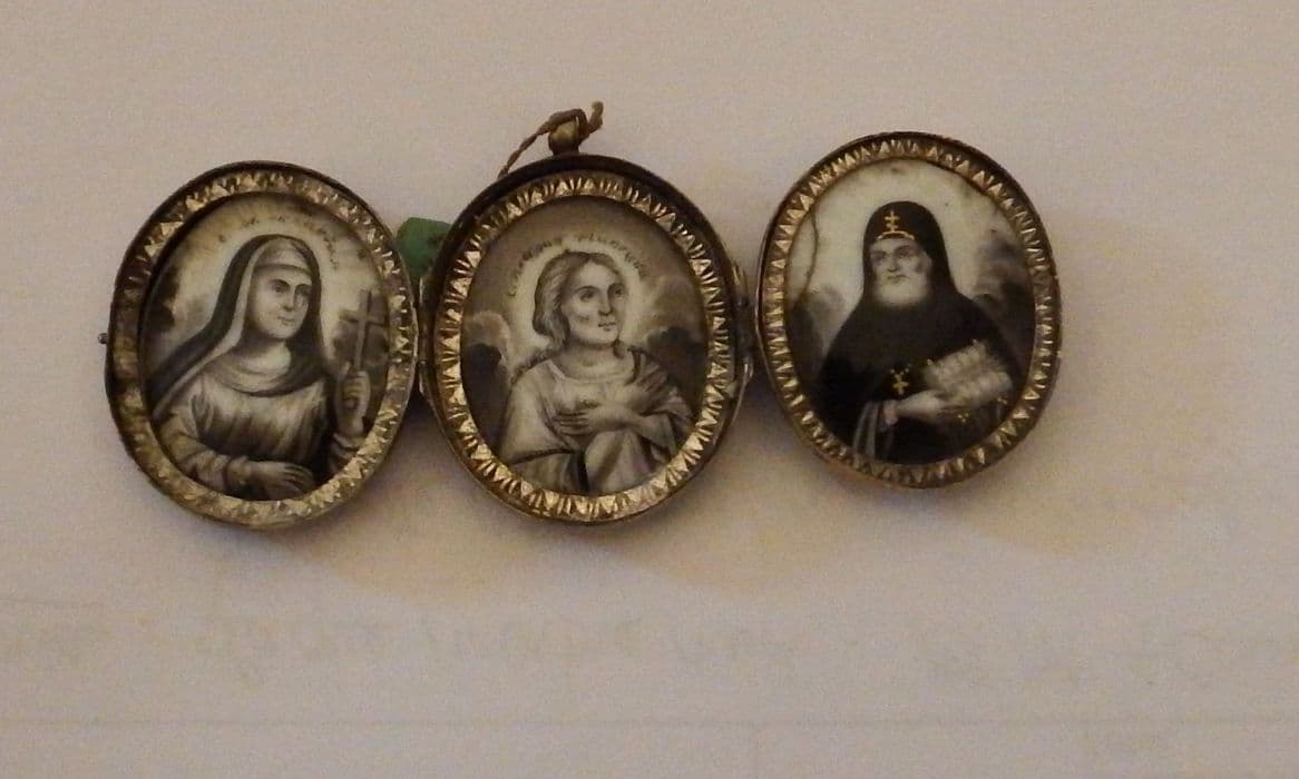 Inv. 109 bis. Argenterie (supplément) : médaillon d'argent, décomposé en 3 volets réunis par des charnières. Sur l'extérieur de chacun des volets sont gravés, sur celui du centre la Vierge et l'Enfant Jésus, sur celui de gauche une sainte nimbée, sur celui de droite un ange aux ailes éployées. A l'intérieur trois personages dont les noms, peints en grisailles, sont en langue russe.