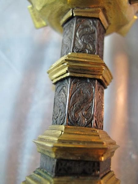 Inv. 115. Cuivre, bronze et fer : monstrance. Au-dessous du dais surmonté d'un pignon, se trouve le Christ debout nimbé, et tenant la croix dans la main droite. Le noeud du pied qui a servi pour un calice, est entouré de 6 médaillons à fleurons niellés. Inscription tout autour sur un fond d'émail bleu.