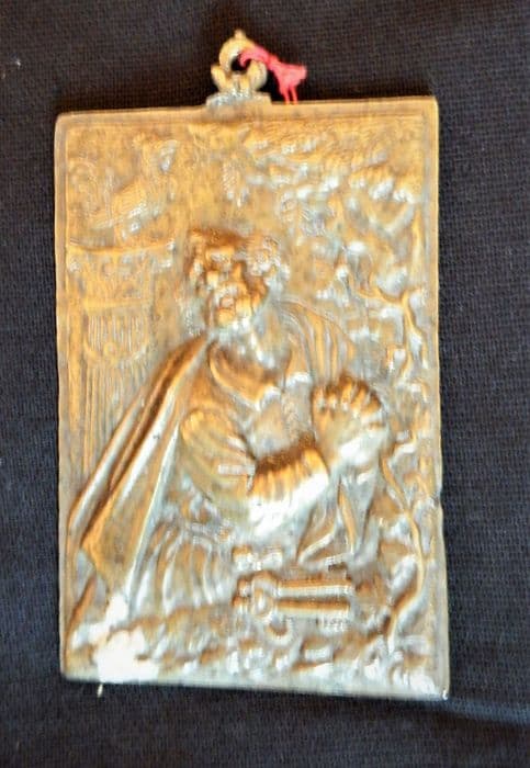 Inv. 134. Cuivre, bronze et fer : plaque rectangulaire, en cuivre repoussé et doré, représentant la pénitence de saint Pierre, d'après une peinture de maître. Au sommet du tableau est un anneau de suspension.