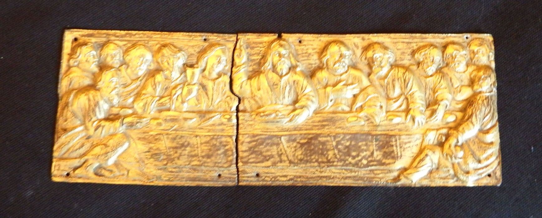 Inv. 138. Cuivre, bronze et fer : plaque rectangulaire en cuivre repoussé et doré, représentant, d'après une peinture de maître, la Cène. Ce tableau est comme à l'ordinaire muni d'un anneau de suspension. Fendu par le milieu.