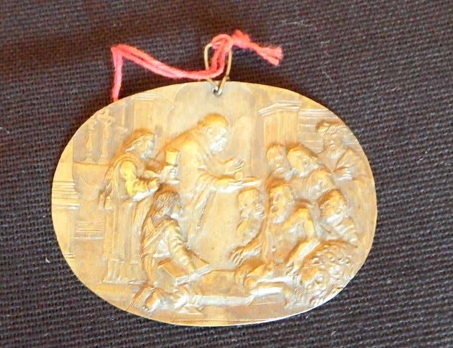 Inv. 152. Cuivre, bronze et fer : médaillon plat et oblong en cuivre repoussé, muni d'un crochet de suspension également en cuivre, et représentant la communion de saint Jérôme, d'après le tableau du Dominiquin.