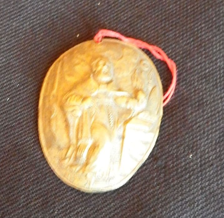 Inv. 159. Cuivre, bronze et fer : médaillon en cuivre repoussé représentant saint Augustin portant sur la main droite le coeur enflammé de Jésus. Ce médaillon est muni d'un trou à la partie supérieure, par lequel on le suspendait ou on le fixait, soit au bras de la croix, soit à un tabernacle, ou à tout autre meuble d'église.