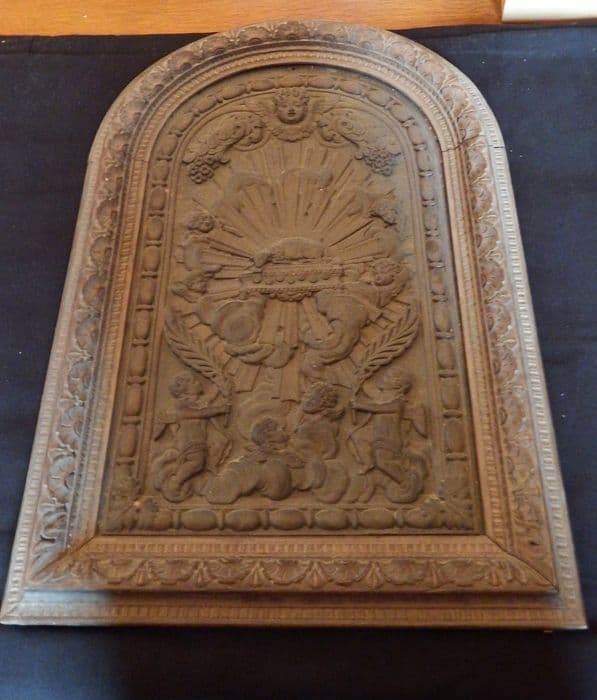 Inv. 163. Cuivre, bronze et fer : porte de tabernacle en bronze, entourée d'un cadre en bois sculpté, représentant un Agnus Dei sur un autel entouré de rayons. En haut, on aperçoit une tête d'ange entre deux cornes d'abondance, au bas des anges tenant des palmes.
