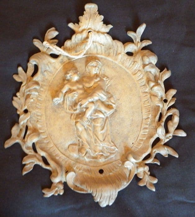 Inv. 164. Cuivre, bronze et fer : plaque ovale en cuivre repoussé, entourée d'un cadre oblong et guilloché, représentant la Vierge tenant l'enfant Jésus. Au sommet sont deux trous de suspension ou d'applique.