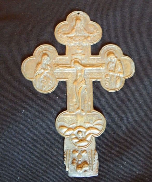 Inv. 184. Cuivre, bronze et fer : croix de cuivre aux extrémités trilobées, représentant, au sommet, Dieu le père entouré de nuages, et aux deux bras de la croix, la Vierge et saint Jean.