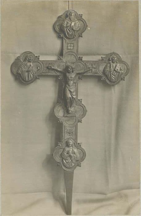 Inv. 190. Cuivre, bronze et fer : croix processionnelle en cuivre émaillé ; sur la croix est étendu le Christ revêtu d'un long jupon, aux quatre extrémités de la croix, et en quatre médaillons, se trouvent les bustes appliqués en relief, de la Vierge, de saint Jean, de saint Jacques et d'un des quatre évangélistes.