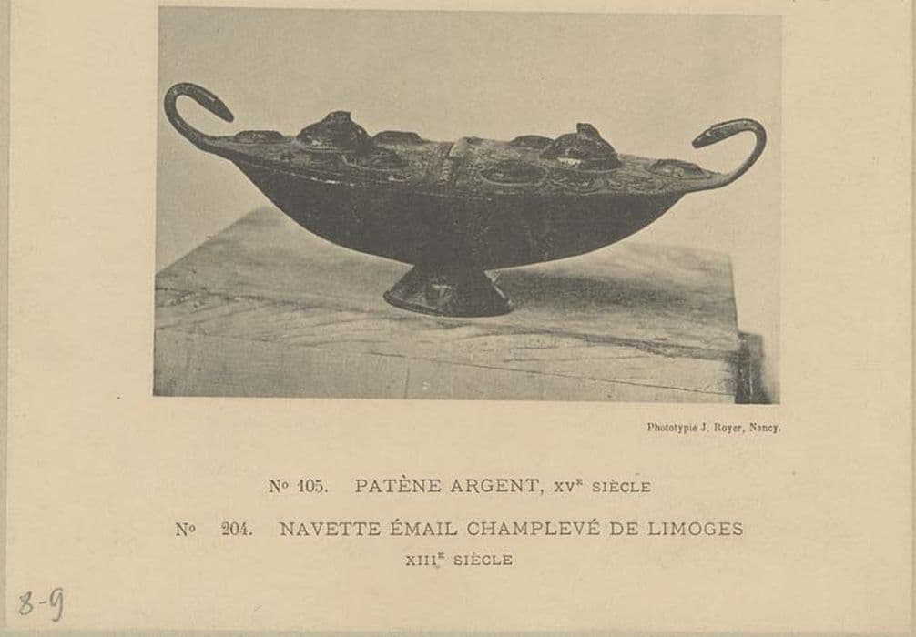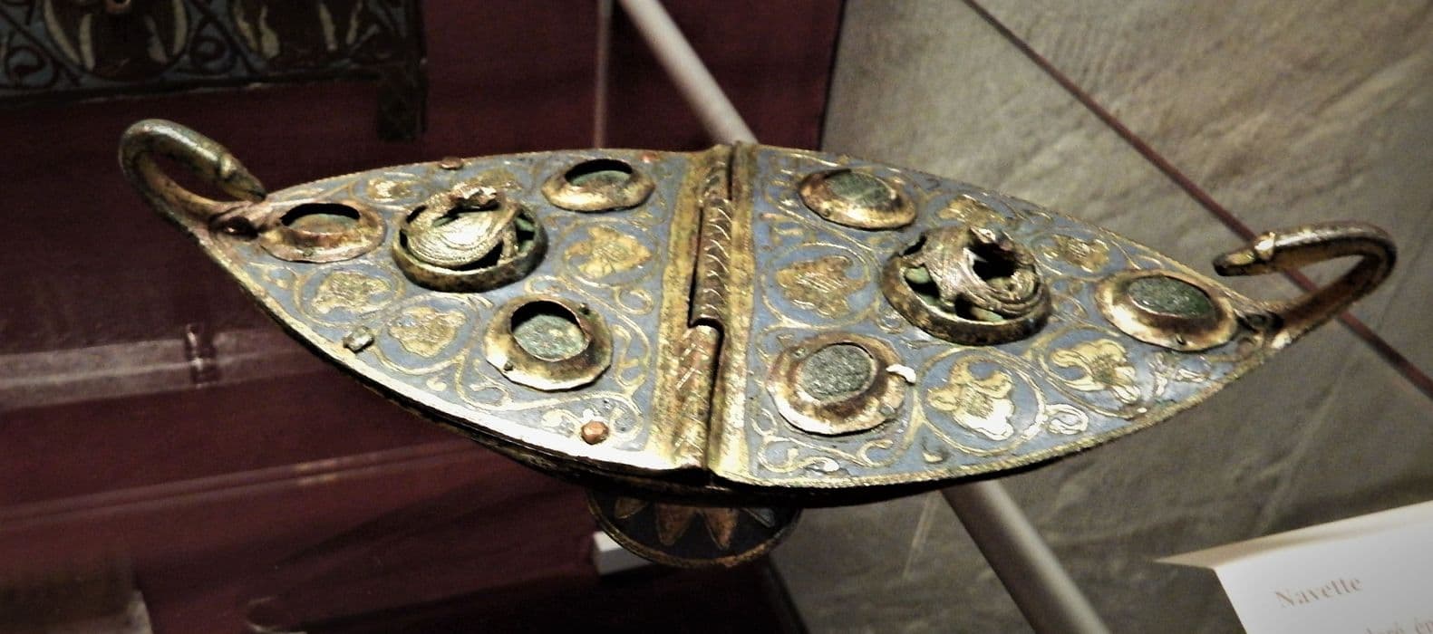 Inv. 204. Emaux : navette. Cuivre champlevé et émaillé. Navette de forme ellyptique montée sur un pied bas, et munie de deux crochets à têtes de serpents, à chacune de ses extrémités. Sur le couvercle qui s'ouvre en deux parties égales, le champ d'émail est à fond bleu, orné de rinceaux et de filets d'or. Ce couvercle est décoré de six médaillons ovales, dont trois contiennent des pierres. A droite et à gauche de la charnière on remarque deux médaillons ronds, à grillages, ornementés de vert et or, et renfermant un lezard doré. Le champ de la partie inférieure est doré, et tout au tour court un lister bleu, endenté et pointillé d'or.