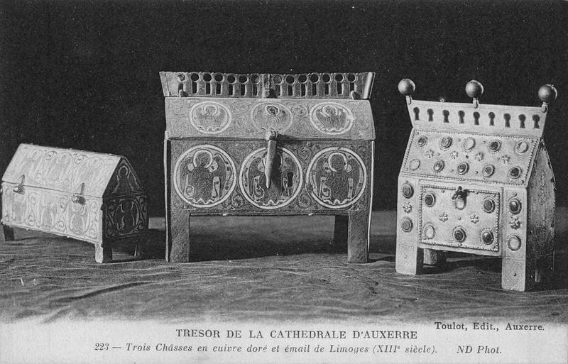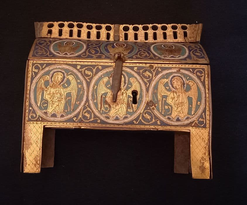 Inv. 206. Emaux : châsse. Cuivre champlevé, émaillé et doré. Châsse en forme de maison sur quatre pieds carrés. Crète en forme d'entrée de serrure, dorée. Champ d'émail à fond bleu décoré de rinceaux d'or. Moule en bois. Face antérieure : le panneau supérieur est orné de médaillons ronds, à fond blanc et vert clair, où sont inscrits des rosaces bleues et bordées d'or, de blanc et de vert clair. Le panneau intérieur et la face postérieure sont décorés de médaillons ronds à fond vert clair, compris entre un filet blanc ou vert clair et deux filets d'or, représentant des anges dorés aux ailes éployées, et nimbés de bleu, de blanc, or et rouge. Pignons : même décoration qu'au panneau supérieur de la face antérieure.