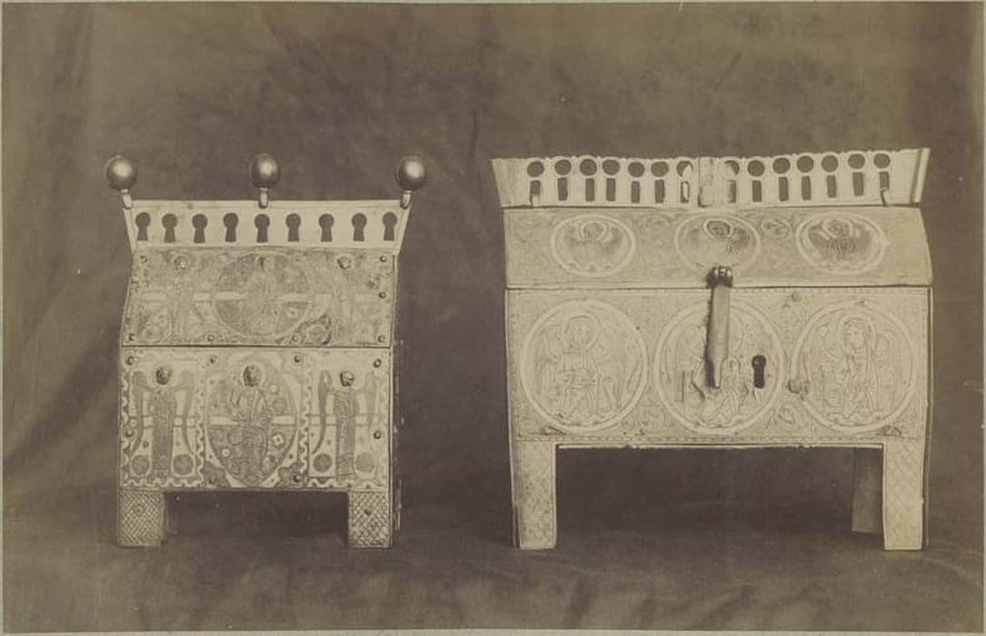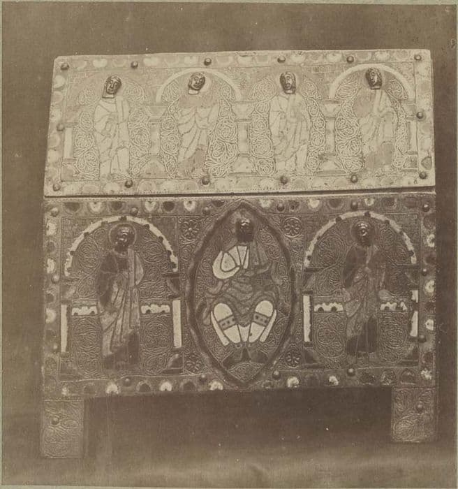 Inv. 210. Emaux : châsse. Cuivre champlevé, émaillé et doré. Châsse en forme de maison sur quatre pieds carrés, surmontée d'une galerie moderne surmontée elle-même de trois boules dorées. Moule de bois. Face antérieure : champ d'émail bleu traversé d'une barre d'émail vert entre deux listels d'or. Au centre, le Christ entre deux anges aux ailes éployées. Figures dorées et rapportées. Face postérieure : moderne et semée de pierres fausses. Pignons : champ d'émail à fond bleu barré de vert. Evangélistes la tête ornée d'un nimbe d'émail vert bordé d'un filet d'or.