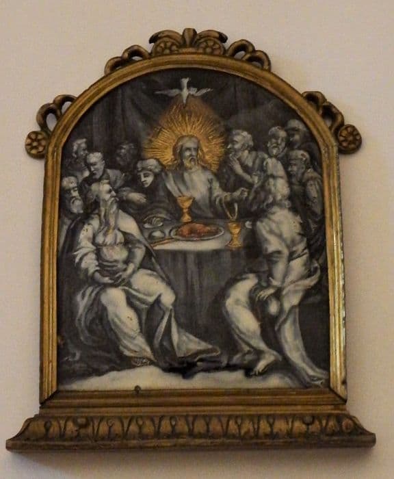 Inv. 227. Emaux : plaque. Plaque de cuivre contenue dans un cadre de cuivre doré et représentant en une magnifique grisaille la Cène présidée par Jésus-Christ, sur lequel le Saint-Esprit descend sous la forme d'une colombe.