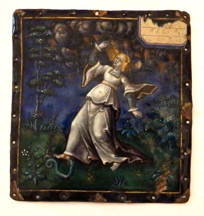 Inv. 230. Emaux : émail. Email peint et polychrome, aux tons blanc, bleu foncé, vert et violet foncé, représentant Eve en costume de l'époque, mordue au talon par un serpent.