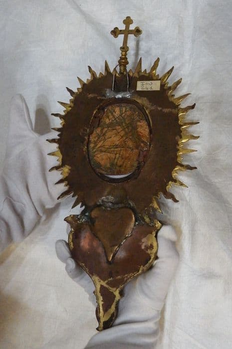 Inv. 241. Emaux : bénitier. Bénitier en cuivre doré surmonté d'une croix, orné de rayons, et décoré de têtes d'anges ailées. Au-dessus de la coquille, émail peint et polychrome, aux tons blanc, or, vert et violet foncé, représentant saint Luc l'évangéliste.