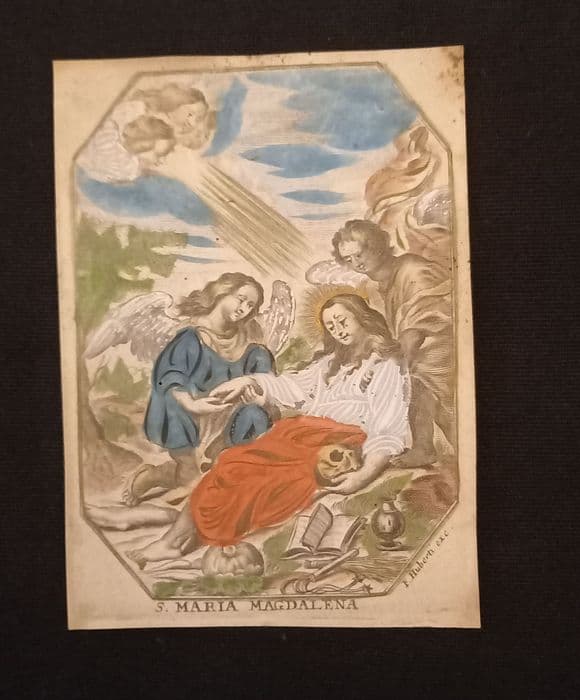 Inv. 250. Gravures et dessins : gravure. Cadre en bois sculpté, contenant une gravure en couleur, où est figurée la mort de saint Madeleine.