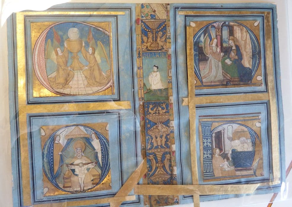 5 enluminures (lettres ornées) : L'Adoration de l'hostie par deux anges, Dieu le père entre deux anges, présentant au monde son fils crucifié, L'Annonciation, La Naissance de la Vierge, Moine agenouillé