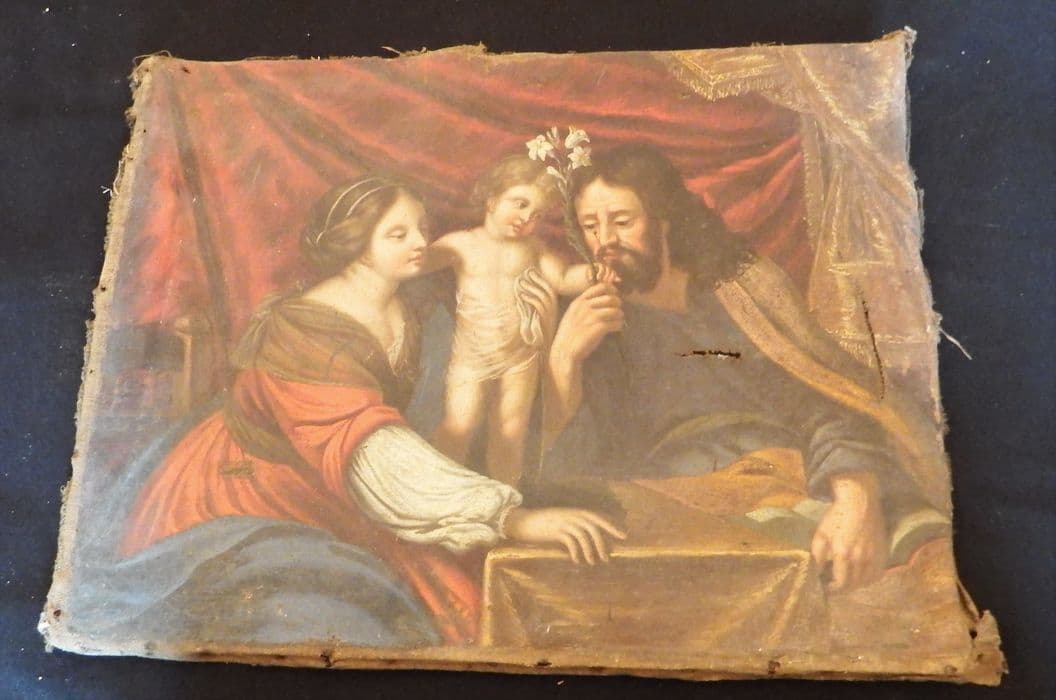 Inv. 266. Peintures, sur toiles, sur verre, sur bois et sur cuivre : peinture. Peinture sur toile, renfermée dans un cadre de bois dédoré, et représentant le Christ enfant entre la Vierge et saint Joseph, auquel il offre une fleur de lys.