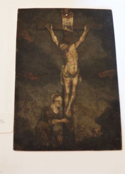 Inv. 278. Peintures, sur toiles, sur verre, sur bois et sur cuivre : peinture. Peinture sur cuivre représentant, sur fond d'or, la Vierge et l'enfant Jésus nimbés, et couronnés de diadèmes de perle. Au dos, un Christ aux bras rapprochés ayant la Madeleine agenouillée à ses pieds.