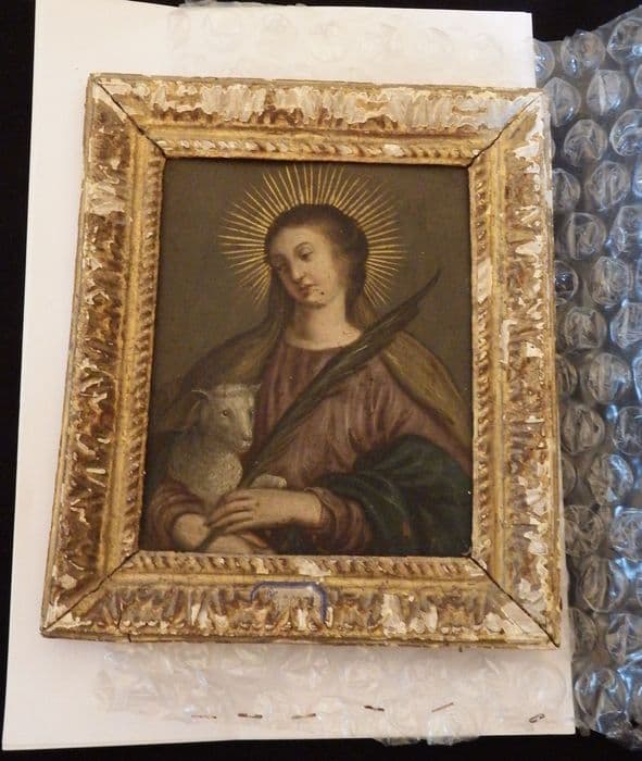 Inv. 280. Peintures, sur toiles, sur verre, sur bois et sur cuivre : peinture. Tableau rectangulaire entouré d'un cadre de bois doré, représentant, peinte sur cuivre, sainte Agnès nimbée.